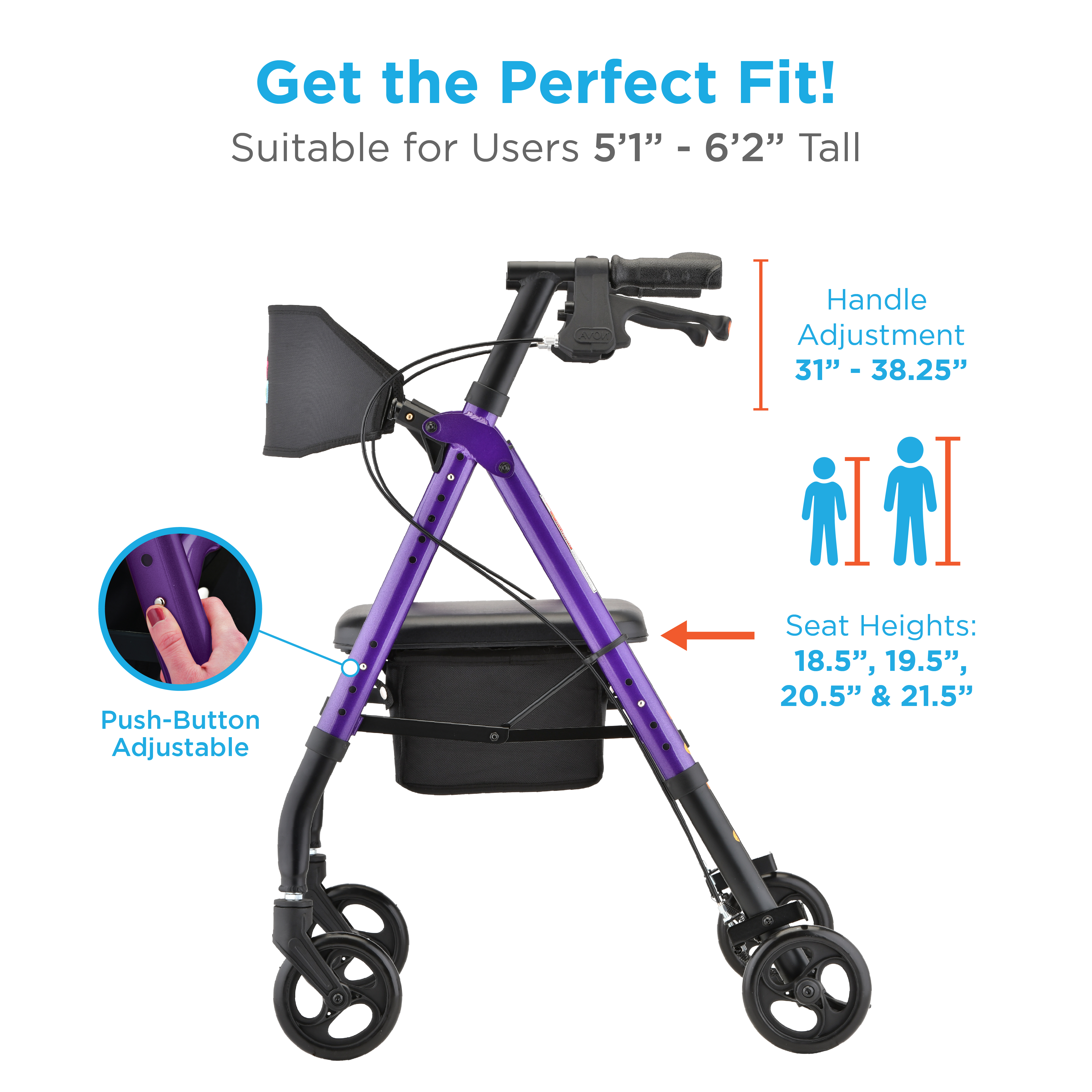 The NOVA STAR 6 is ideal for users measuring 5’1” to 6’2”. People within that height range can easily adjust the seat height and handles to get a perfect fit! This makes it so much easier to sit down in / rise up from the seat and also to keep good posture while using the rollator.